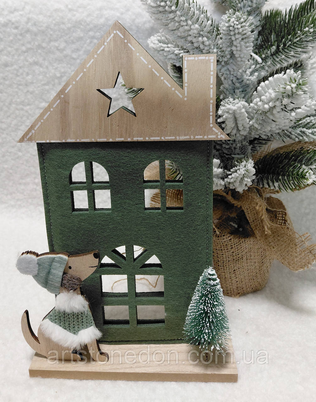 Затишна новорічна інсталяція у вигляді зеленого будиночка з дерев’яним песиком у зимовому одязі стане милою прикрасою вашого святкового декору. Завдяки поєднанню дерева, текстилю та пухнастих деталей композиція виглядає об’ємною, теплою та домашньою.